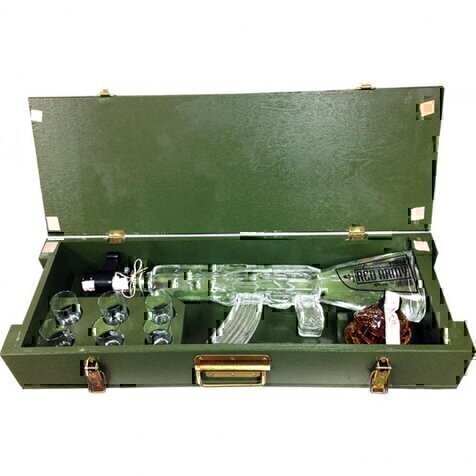 Red Army Vodka Ak-47 Калашников была создана в России в 1995 году к 40-й годовщине победы во Второй Мировой войне. Уникальную тару для подарочного комплекта разработали во Франции, на одном из известных в мире стекольном заводе Saverglass. Комплект поставки Red Army Vodka Ak-47 включает в себя бутылку в виде легендарного автомата Калашникова (выполненную из армированного металлом стекла), шесть стопок с эмблемой красной армии, стеклянную «гранату» с травяным ликером и деревянный ящик-кейс.